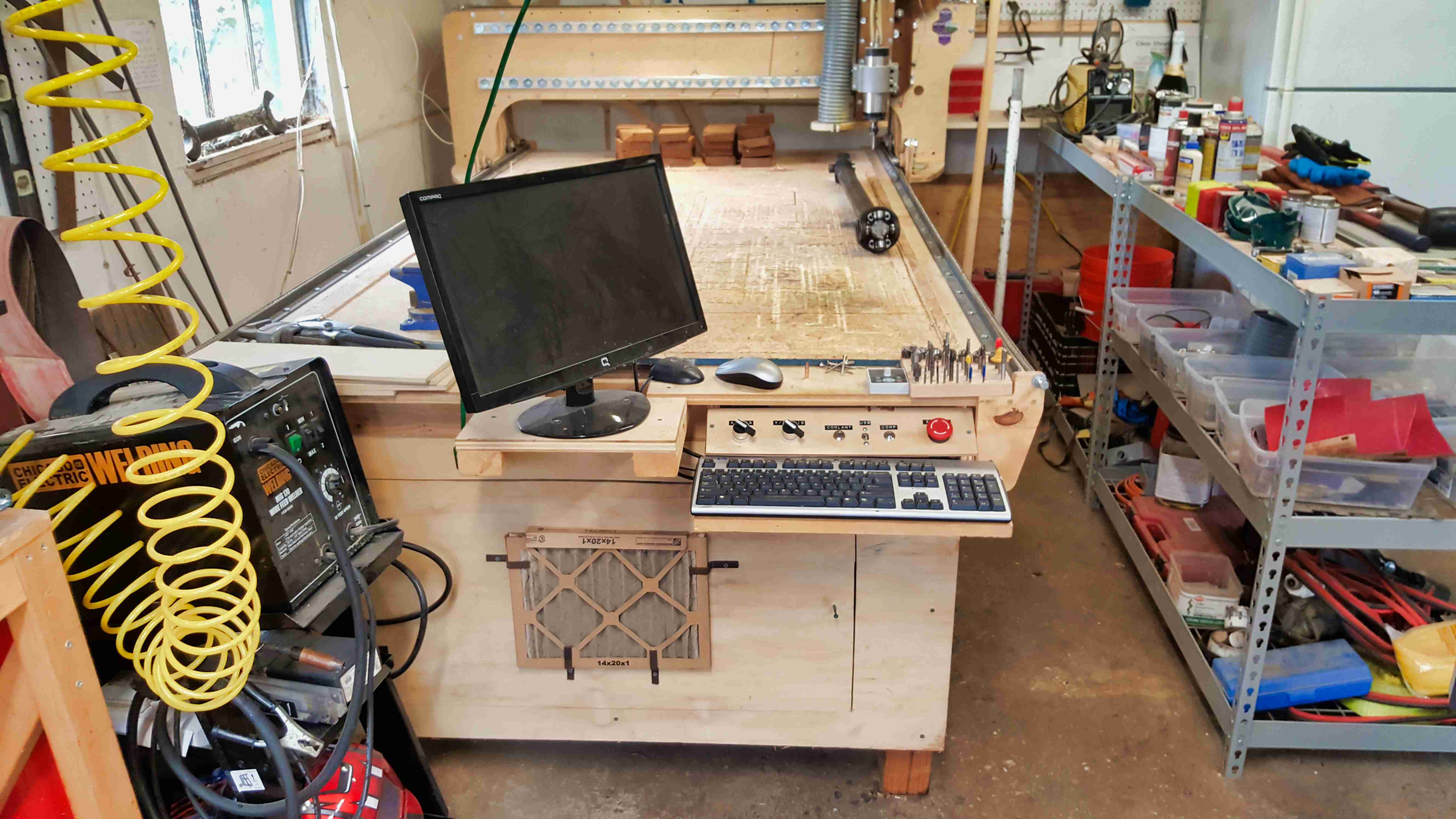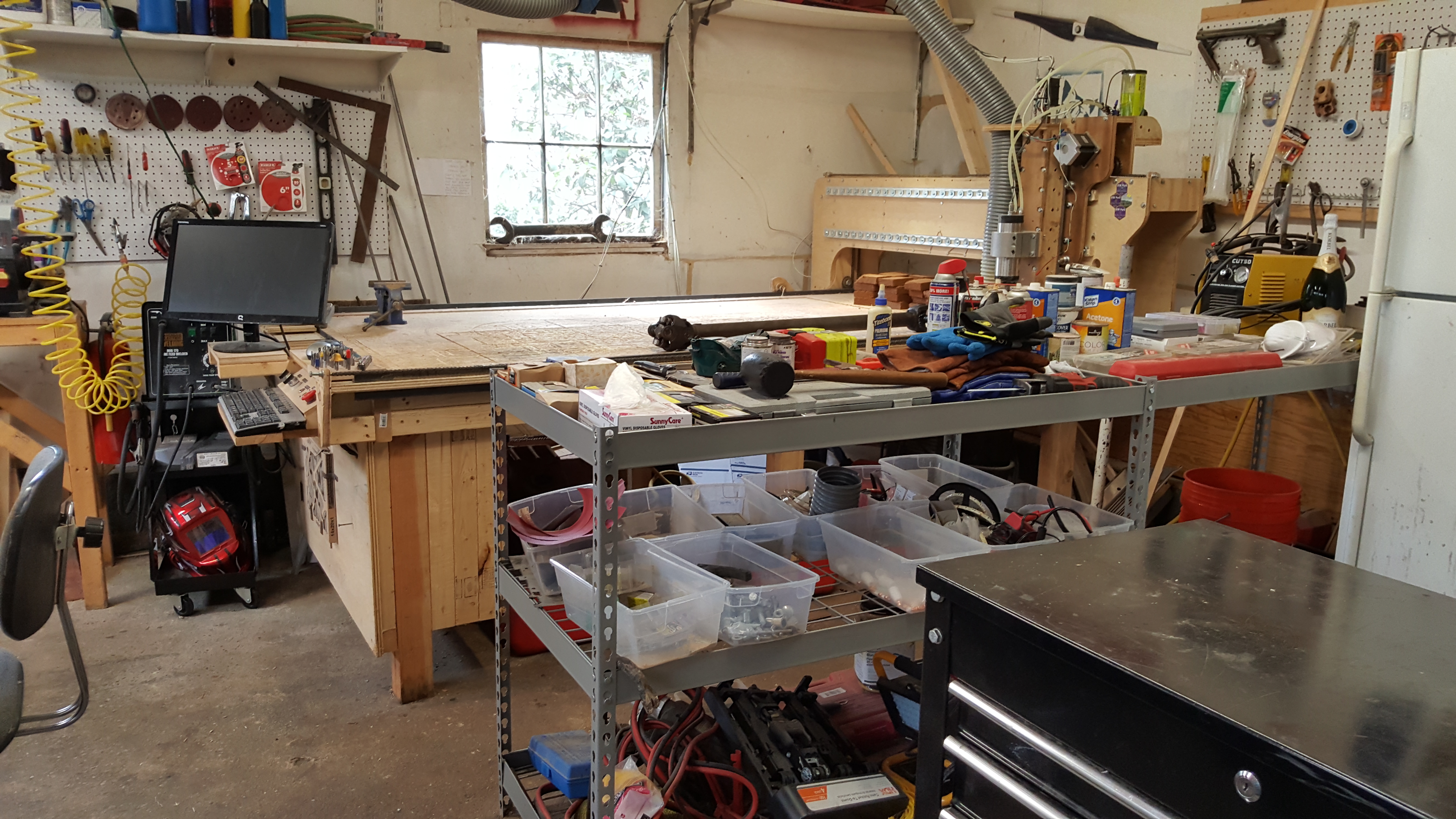 This mill was new as of around December or 2015, and man was it an upgrade. The last one was all MDF with leadscrew drives. It was perhaps a tad more precise than this one, but was super slow, and was falling apart because, well, it was MDF. This new guy took me 2 months or so, but has almost all the trimmings a good machinist would want. Maybe without an A axis, but all the same. 600 IPM max jog, 48" X 78" area, adjustable speed three phase water cooled spindle, and a taller gantry. Thankfully with all these upgrades we can cut some softer metals. True, it takes a while because I need to make a few passes, but it's very do-able. I also spent a lot of time making sure everything was well assembled, and all the cabling was clean; that was also a huge issue with the last one. As for the rest of the shop, it changed with the machine. I got a better understanding of what I wanted to do and what CDLA was capable of as a company, and geared new equipment towards those goals. With a mig welder, grinder, lathe, and plasma cutter we're much better at metalwork. And because I started a whole ton of new projects I realized I needed more table space. So, more tables were added. Obviously.